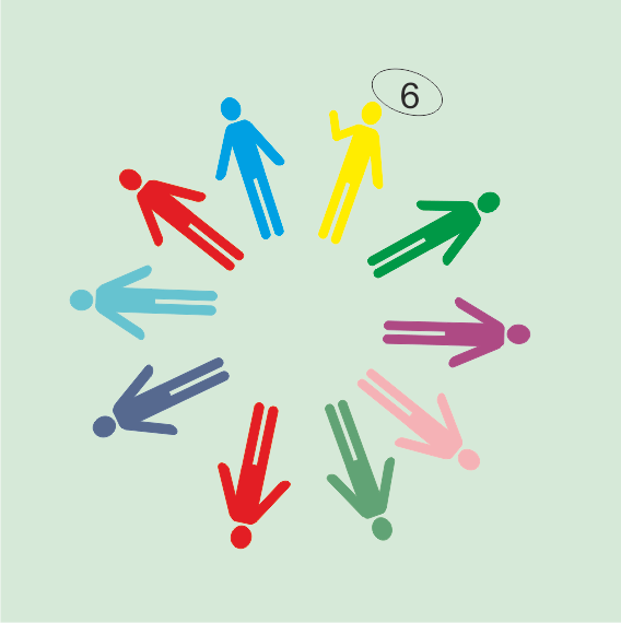 A játékosok körben állnak. Az első játékos kimondja az első számot: 1. Közben megfogja az egyik vállát, ezzel jelezve, hogy melyik irányba indítja a játékot: ha a bal vállát fogja meg, akkor a tőle balra álló mondja a következő számot, a kettőt. Ő szintén megfogja valamelyik vállát, ezzel jelzi, hogy a tőle balra vagy jobbra állótól várja-e a következő számot.
