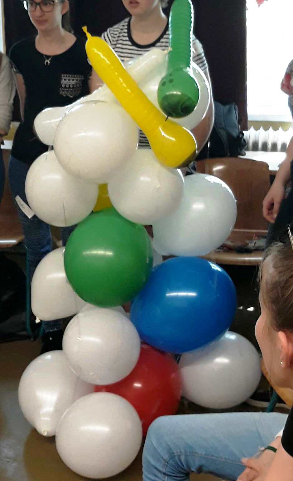 A csapatokra osztott tanulók építsenek minél magasabb várat, tornyot a léggömbökből. Felfújni is nekik kell! A játék időre megy, érdemes kb. 15-20 percet szánni rá.