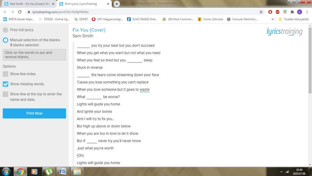 Azonban a weboldalnak van egy olyan kevésbé ismert funkciója is, amellyel kinyomtathatjuk a dalszöveget (így minden diák dolgozhat) és mi magunk választhatjuk ki, hogy melyek legyenek a hiányzó szavak. Ez úgy érhető el, hogy miután kiválasztottuk a dalt, lentebb görgetünk és a „Print Lyrics”-re kattintunk. Ezután megjelenik a dalszöveg, és azokra a szavakra kell kattintani, amelyeket szeretnénk, ha a diákok találnának ki. Utána nyomtathatjuk is.
