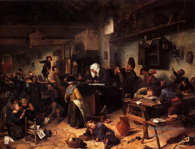 Kivetítünk egy festményt, amin sok alak látható, mint például Jan Steen: Egy iskola lányoknak és fiúknak című festménye.